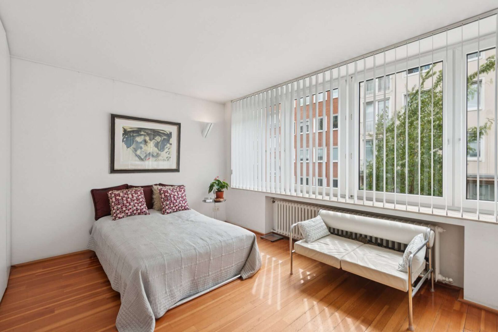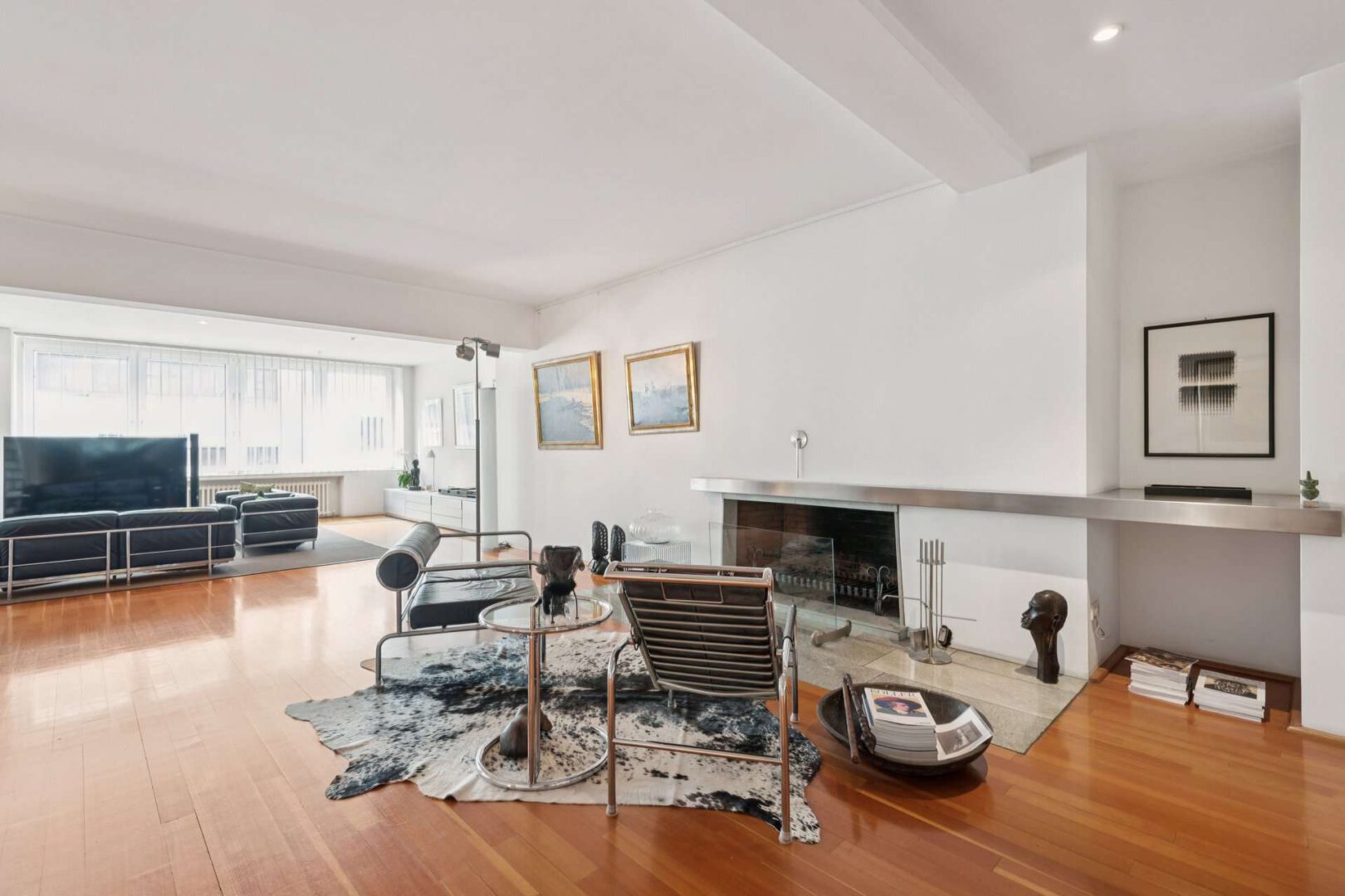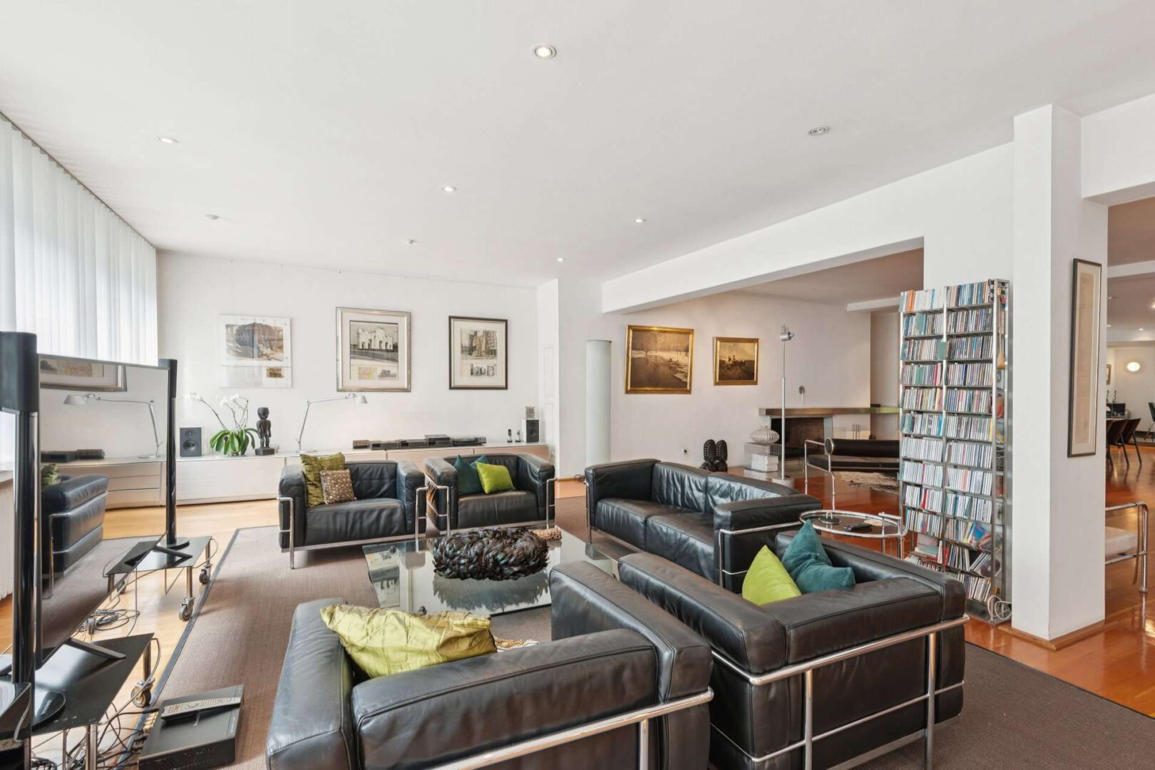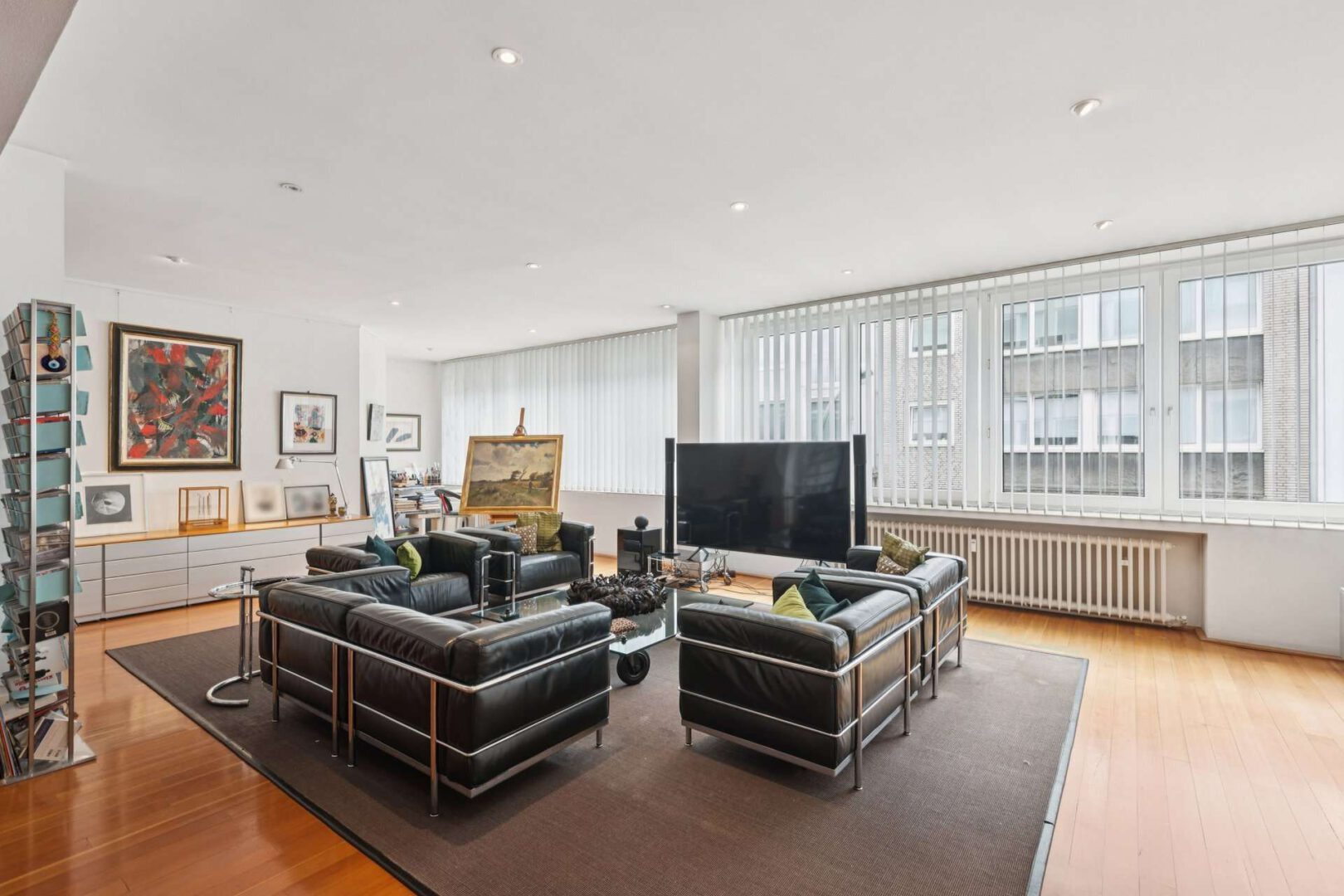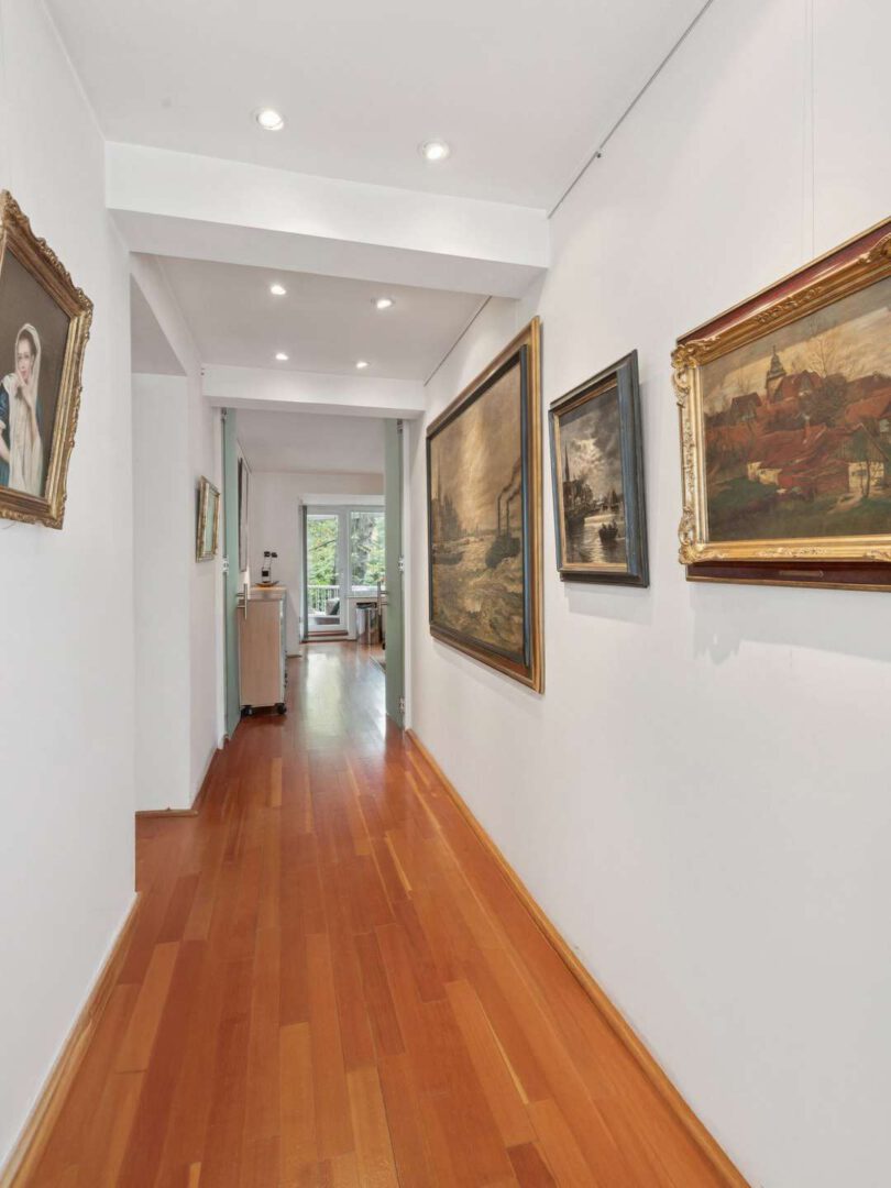 Praktische Galerieleisten auf fast allen Flächen ermöglichen individuelle Gestaltungsvarianten, die das flexible Hängen von Kunstwerken und Dekoration erlauben. Dezente Einbauschränke bieten zudem ausreichend Stauraum, ohne den großzügigen Charakter der Räume zu beeinträchtigen.