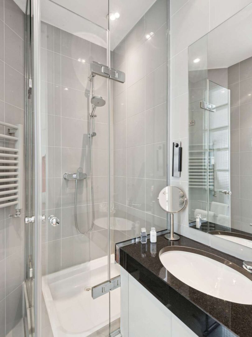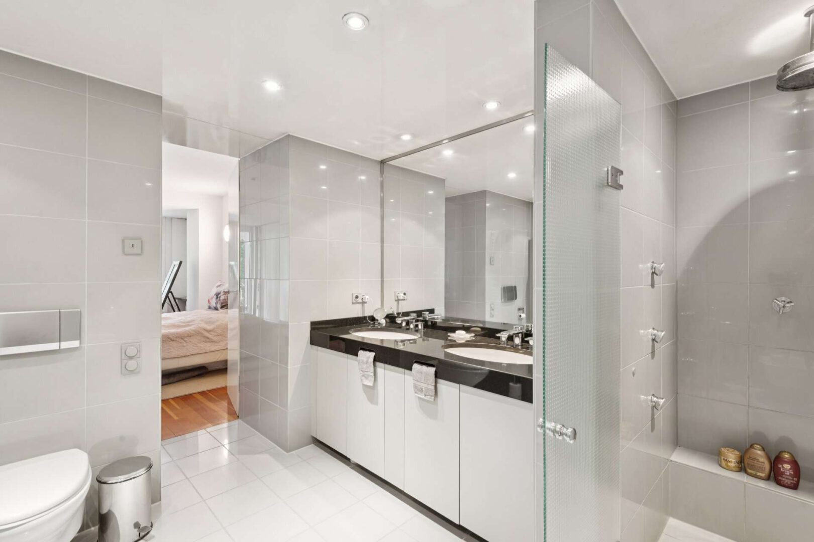 Zwei Vollglastüren führen von der Wohnfläche in den privaten Rückzugsbereich, dessen Herzstück der großzügige Master-Bedroom mit ca. 35 m² ist. Der Bereich mit Bad en Suite wurde als Ruhezone konzipiert und bietet direkten Zugang zur einladenden Loggia. Ein zusätzliches Gäste- oder Arbeitszimmer mit eigenem Duschbad bietet vielfältige Nutzungsmöglichkeiten.