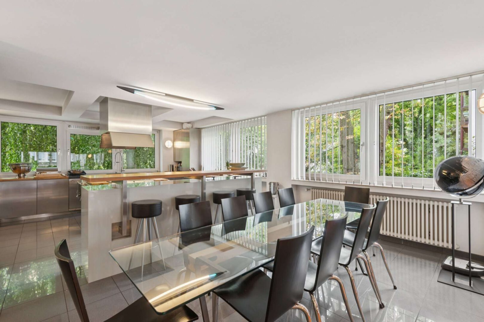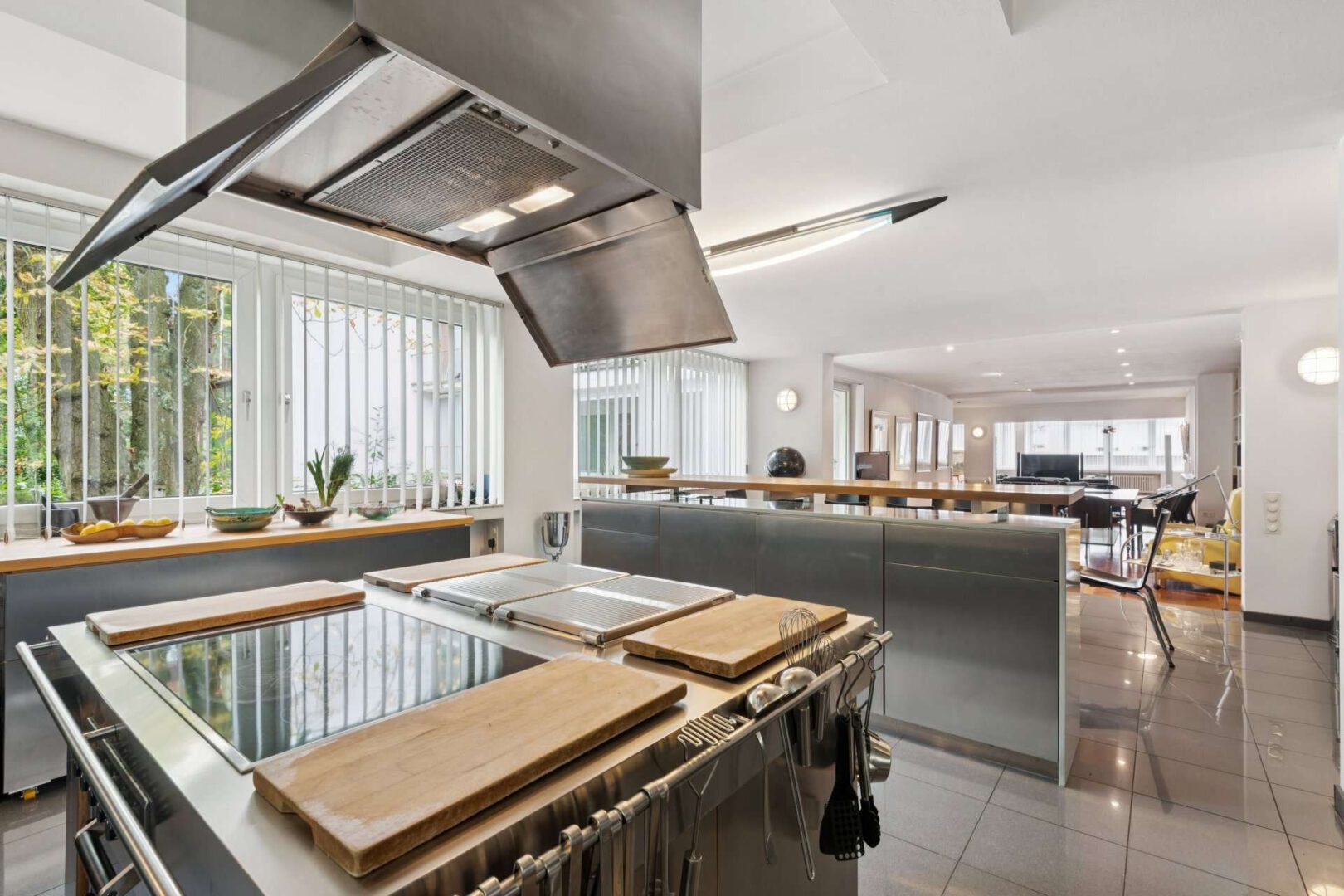 Die Wohnung überzeugt nicht nur durch ihre außergewöhnliche Gestaltung, sondern auch durch zahlreiche technische Raffinessen, die höchsten Wohnkomfort garantieren. Ein Lautsprechersystem bietet in der Küche, im Bad und im Gäste-WC eine harmonische Klangkulisse, während großflächige Fenster mit Lamellenjalousien eine individuelle Regulierung des Lichteinfalls ermöglichen.